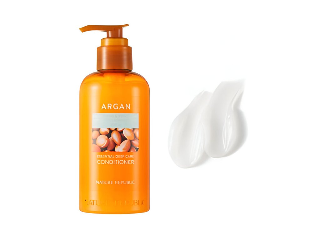 Nature Republic Argan Essential Deep Care kondicionér vyrobený se 100% organickým arganovým olejem, šípkovým olejem a petrklíčovým olejem extrémně bohatým na prospěšné živiny pro jemnější, hedvábnější a zdravější vlasy. Vysoce koncentrovaný organický arganový olej je vynikající pro opravu poškozených vlasů tím, že intenzivně hydratuje vlasy a zároveň poskytuje základní výživu, jako jsou mastné kyseliny a vitamín E. Vynikající při opravě roztřepených konečků a lámavých vlasů.