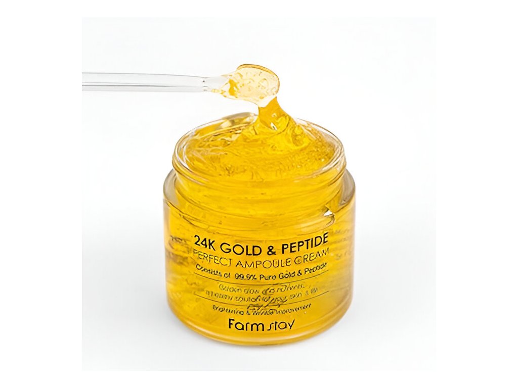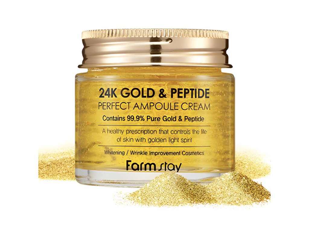 Farm Stay 24K Gold & Peptide Perfect Ampule Cream obsahuje silné složky proti stárnutí, které mají intenzivní omlazující účinek. Krém hloubkově hydratuje, předchází vysoušení a ochabování pokožky, poskytuje vypínací efekt, vyhlazuje stávající vrásky a předchází vzniku nových, bojuje proti pigmentaci a nerovnoměrnému tónu pleti, zvyšuje elasticitu a pevnost, chrání před negativními účinky volných radikálů.