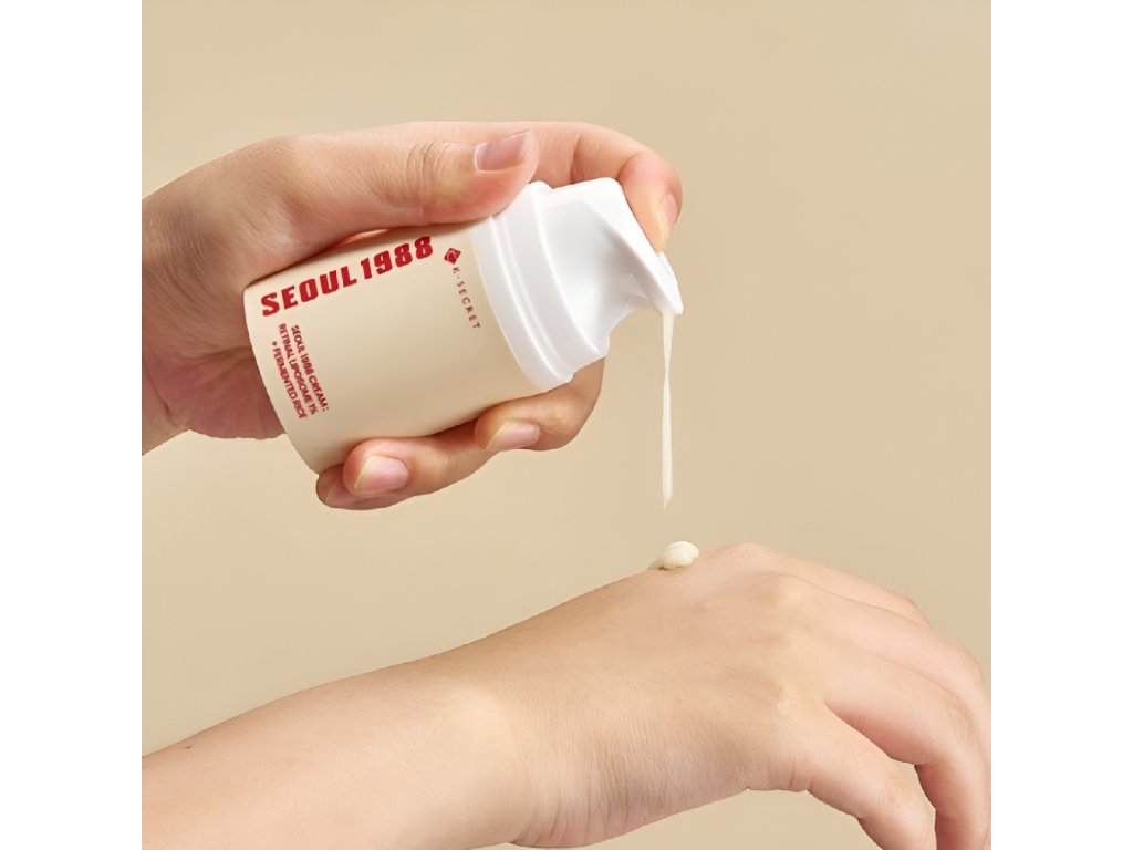 K-Secret Seoul 1988 Cream: Retinal Liposome 1% + Fermented Rice je krém proti stárnutí, který redukuje výskyt jemných linek a vrásek a zároveň zvyšuje elasticitu a pevnost pleti. Je navíc obohacen o tři typy peptidů, bakuchiol a vitamín C pro podporu tvorby kolagenu, antioxidační a rozjasňující vlastnosti. Hladká a krémová textura se rychle vstřebává do pokožky a zanechává nemastný povrch. Obsahuje 1% retinal liposomů a fermentovanou rýži, které podporují přirozené procesy v pleti.