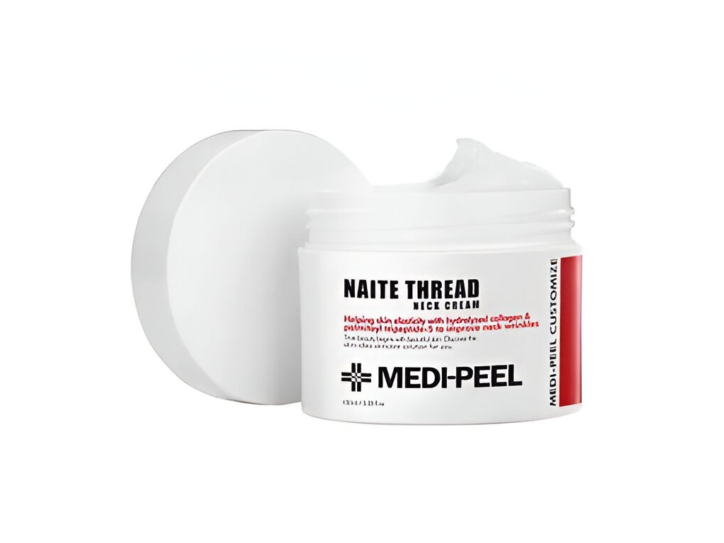 Stahující krém na krk s peptidovým komplexem Medi-Peel Naite Thread Neck Cream má výrazný liftingový efekt, vyhlazuje a redukuje hloubku vrásek, pomáhá v boji proti kožním vráskám a Venušiným prstencům.