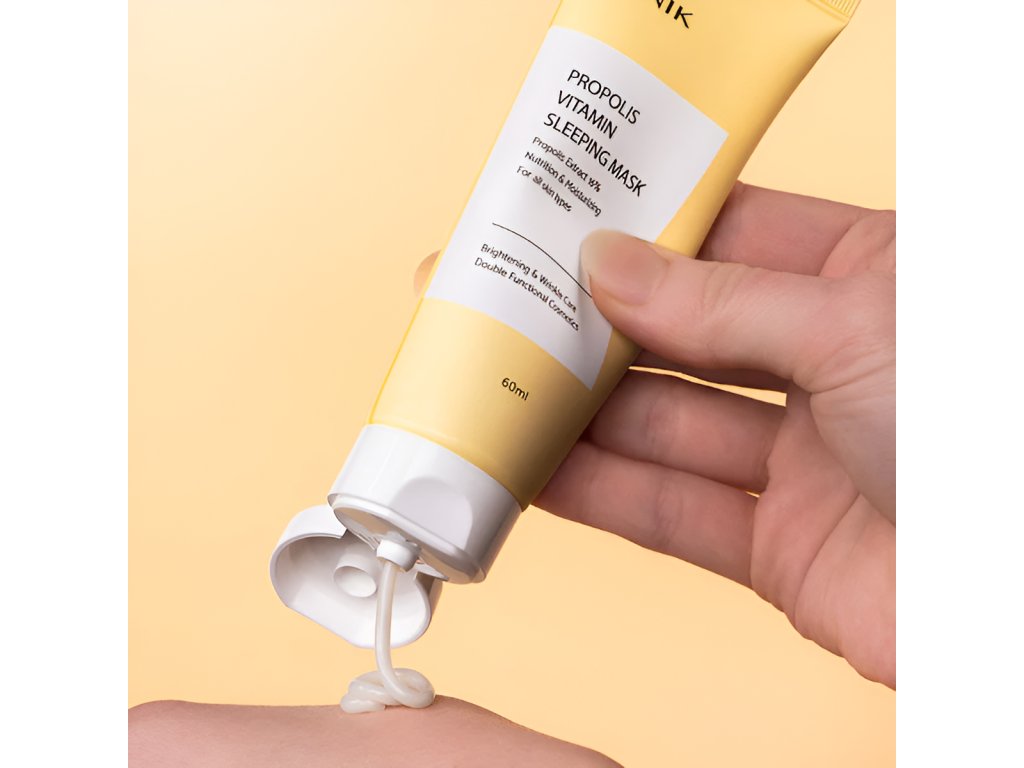 iUnik Propolis Vitamin Sleeping Mask je noční maska vyvinuta speciálně pro suchou, matnou pleť. Směs extraktu propolisu a extraktu z rakytníku vyživuje a rozjasňuje vaši pokožku. Tato úžasně jemná maska má také zpevňující účinek a zajišťuje opětovné zklidnění namáhané pokožky.