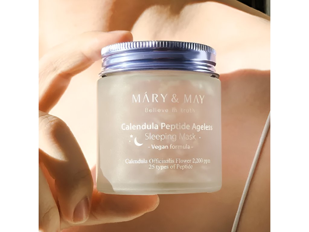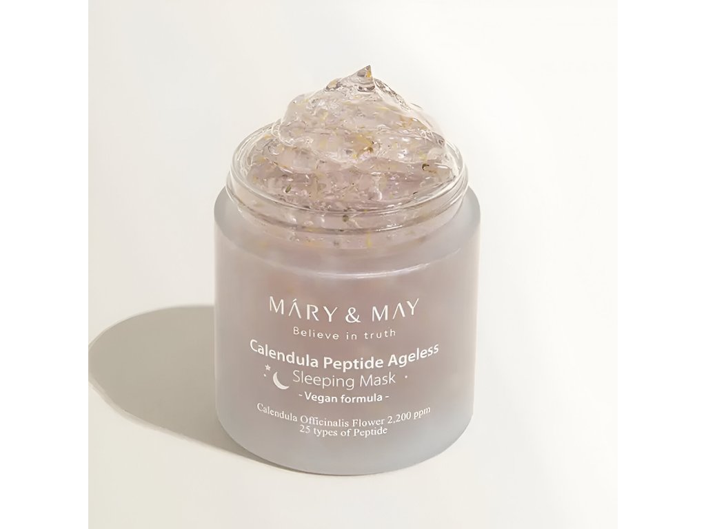 Noční maska proti stárnutí s okvětními lístky měsíčku Mary & May Calendula Peptide Ageless Sleeping Mask má silný zklidňující účinek, zmírňuje svědění a zarudnutí, stimuluje hojení podráždění. Má celkový posilující účinek, působí na zvýšení elasticity a pevnosti tkání, usrkává a zpomaluje proces stárnutí.