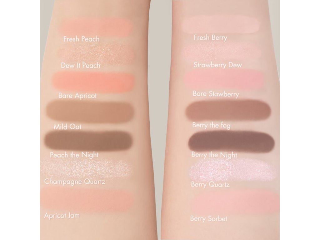 01 Apricot Mood s teplými broskvovými odstíny. Obsahuje 2 tmavé tóny v jedné náplni, které se skvěle hodí pro ztmavení vnějšího koutku očí: Peach The Night a Mild Oat. Osvěžující meruňkové odstíny Fresh Peach a Bare Apricot se hodí na pohyblivé víčko, které lze také ozdobit třpytivým odstínem Dew It Peach. Třpytivý Champagne Quartz vytvoří jasný akcent a jemný broskvový odstín Apricot Jam je ideální jako tvářenka.