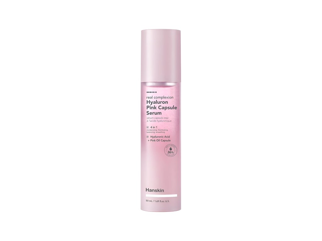 Hanskin Hyaluron Pink Capsule Serum je hyaluronové sérum obsahující kapsle s růžovým olejem, které při kontaktu praskají, uvolňují živiny, které hydratují pokožku a dodávají jí silný lesk.