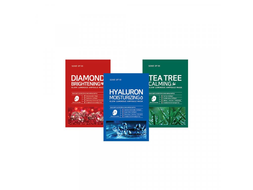 Some By Mi Glow Luminous Ampule Mask pro různé typy pleti. Multifunkční masky s ultratenkým plátýnkem mají komplexní účinek na pokožku, účinně hydratují, zklidňují a obnovují. Masky jsou bohatě nasyceny ampulkovou esencí, která umožňuje všem aktivním složkám produktu proniknout hluboko do epidermis a ultratenká báze pevně přilne k pokožce, sleduje kontury obličeje a zabraňuje ztrátě vlhkosti.