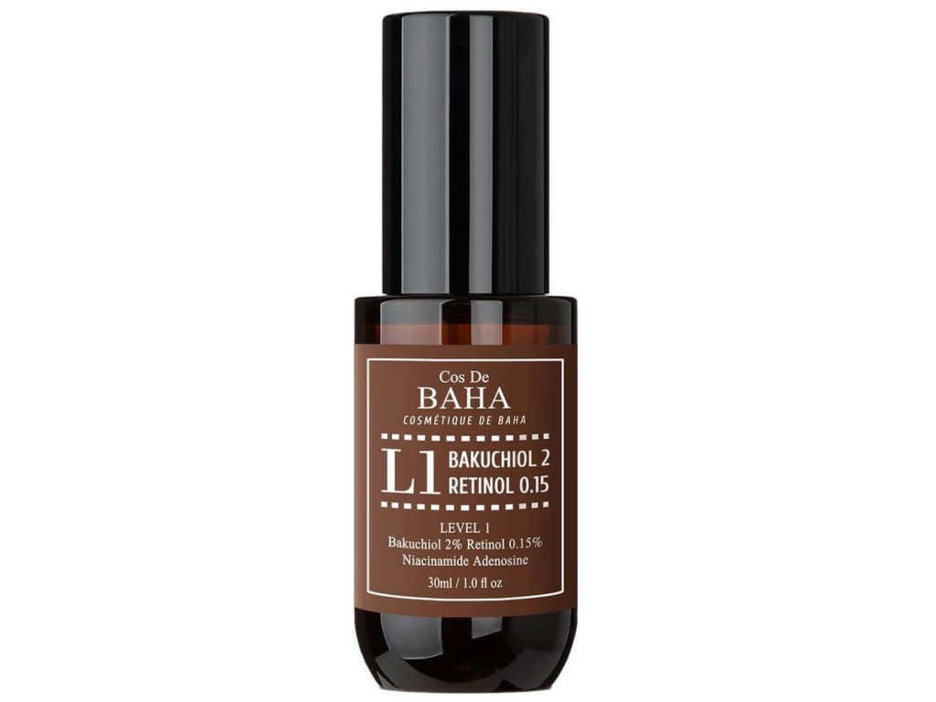 Sérum Cos De Baha L1 Bakuchiol & Retinol vyhlazuje a zpevňuje pleť, redukuje vrásky, sjednocuje tón pleti a zmenšuje výskyt stařeckých skvrn a jizev po akné, přičemž zároveň vyhlazuje texturu pleti.