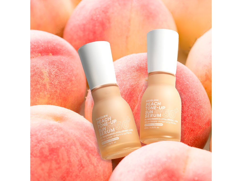 Opalovací sérum s rozjasňujícím tónovacím efektem Peach Tone-Up Sun Serum od nové korejské značky KIKIGLOW díky komplexu filtrů s ochranným faktorem SPF50++++ spolehlivě chrání pleť před různými typy ultrafialového záření a také pomáhá v boji proti pigmentaci a vráskám, viditelně rozjasňuje tón pleti a sjednocuje její povrch. Sérum navíc intenzivně hydratuje pleť a tónovací složky pomáhají dosáhnout okamžitého rozjasňujícího efektu, který pleti dodává atraktivní svěží vzhled.