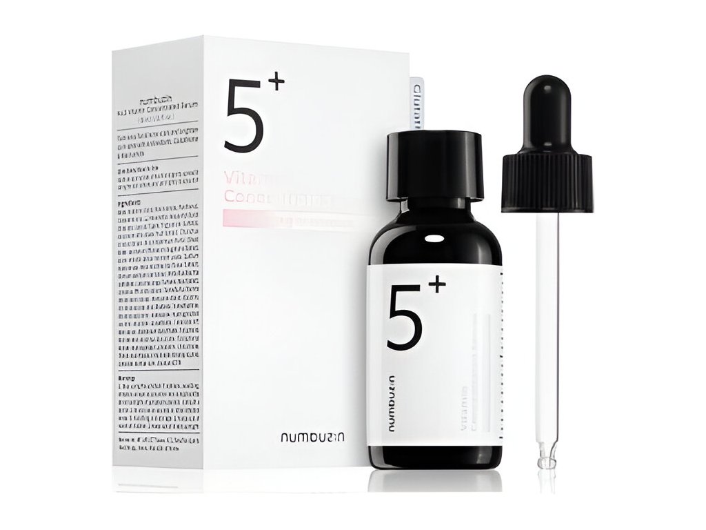 Vitamínové sérum numbuzin No.5 Vitamin Concentrated Serum obsahuje vysokou koncentraci bělících složek, které zabraňují syntéze melaninu v pleti, čímž vyrovnávají tón a zesvětlují stařecké skvrny, pihy a stopy po akné.
