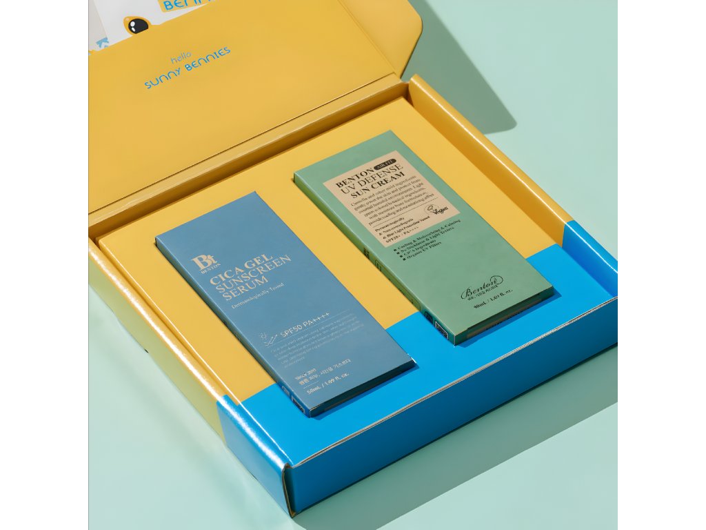 Benton Hello Sunny Bennies Set obsahuje opalovací krémy Benton Cica Gel Sunscreen Serum SPF 50 a Benton Air Fit UV Defense Sun Cream SPF 50+.